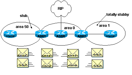 Une default route peut être propagée depuis un ASBR sur tous les routeurs de l’AS en utilisant la commande default-information originate. Ce type de commande est utilsé lorsque la connexion à un prvider se fait par un point unique, au travers d’une route statique.