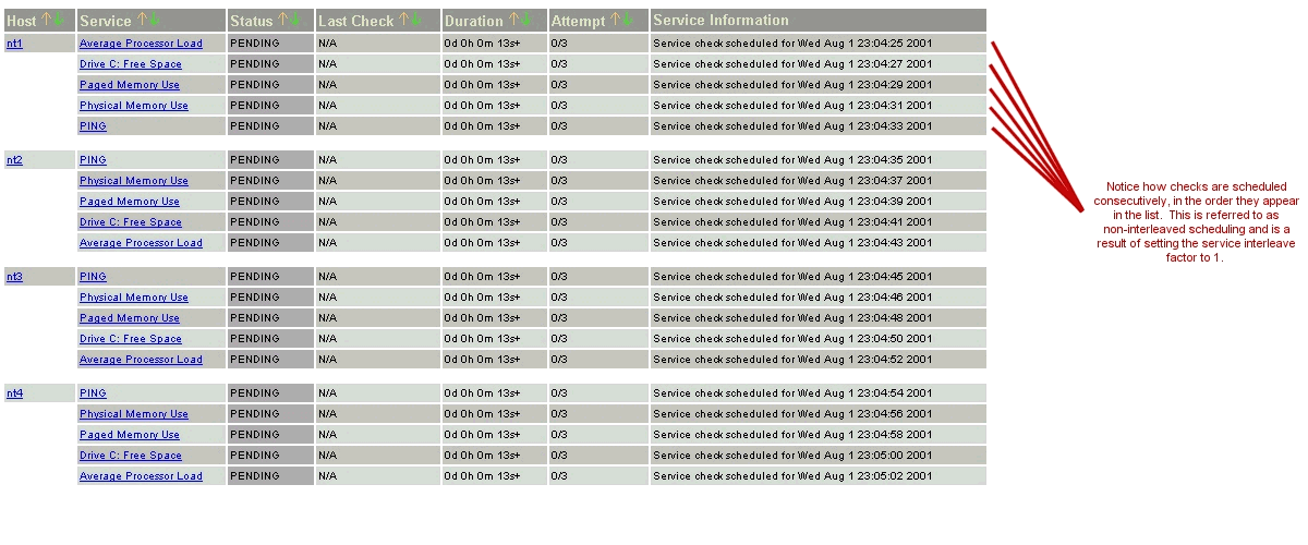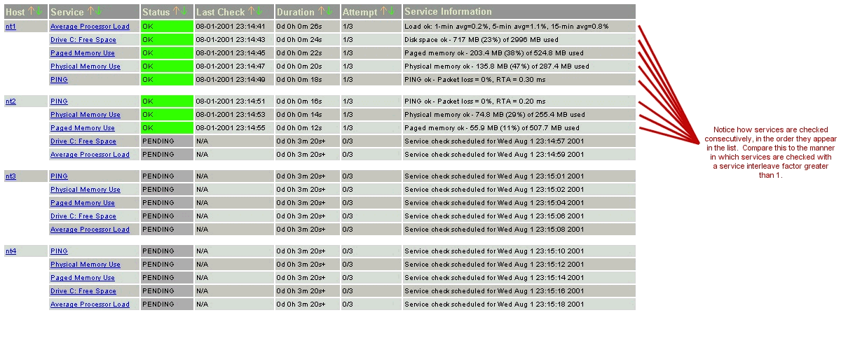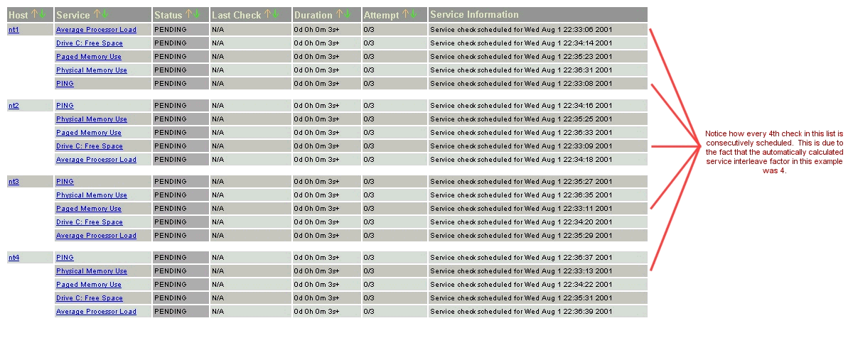 Prenons un exemple. Mettons que vous ayez un total de 1.000 services et 150 hôtes à superviser. Nagios calculera un facteur d'entrelacement de 7. Ceci signifie que quand Nagios ordonnance les contrôles initiaux des service, il ordonnancera le premier qu'il trouvera, sautera les 6 suivants, ordonnancera le suivant, et ainsi de suite... Ce processus se répétera jusqu'à ce que tous les contrôles de service soient ordonnancés. Comme les services sont triés (et donc ordonnancés) selon le nom de l'hôte auquel ils sont associés, cela aidera à minimiser/répartir la charge sur les hôtes distants.