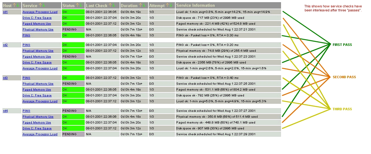Bien que les contrôles des services soient initialement ordonnancés pour répartir la charge sur les hôtes, les choses vont évoluer à terme vers le chaos et être un peu faites au hasard. Cela est dû au fait que que les services ne sont pas tous contrôlés à la même fréquence, que certains services mettent plus longtemps que d'autres à être contrôlés, que des problèmes sur les hôtes etou les services peuvent modifier l'ordonnancement des contrôles, etc. Au moins, nous essayons de faire partir les choses du bon pied. Avec un peu de chance, l'ordonnancement initial permettra de garder la charge assez équilibrée au fil du temps...